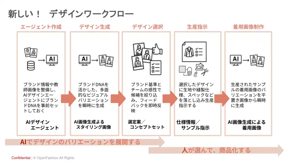 | これまでバラバラだったツールや工程を一つに統合することで、企画から販売までのリードタイムを劇的に短縮。ファッションビジネスにおける、人とAIの「共創」による新しいワークフローを提案します。 | ||||