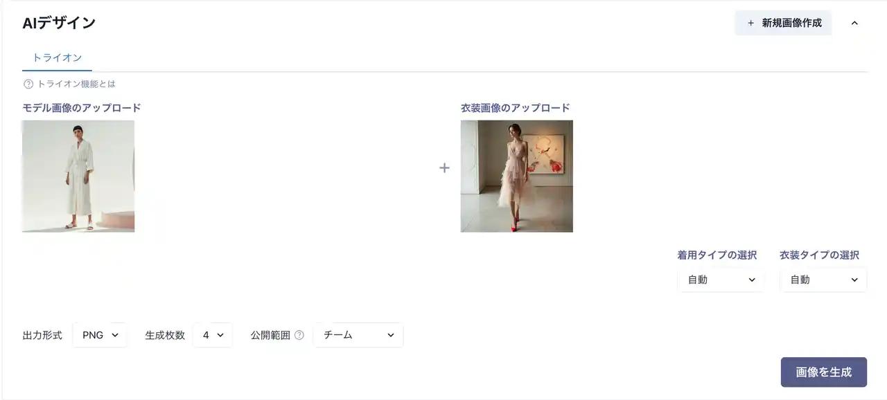 | この度リリースする「着せ付け:Try-On」は、こうした業界の長年の課題を解決する新機能です。ユーザーが用意した「モデル(人物)画像」と「衣装の画像(平置き・着用問わず)」をアップロードするだけで、AIがその服を自然に着こなした高品質な画像を瞬時に、かつ複数パターン生成します。 | ||||