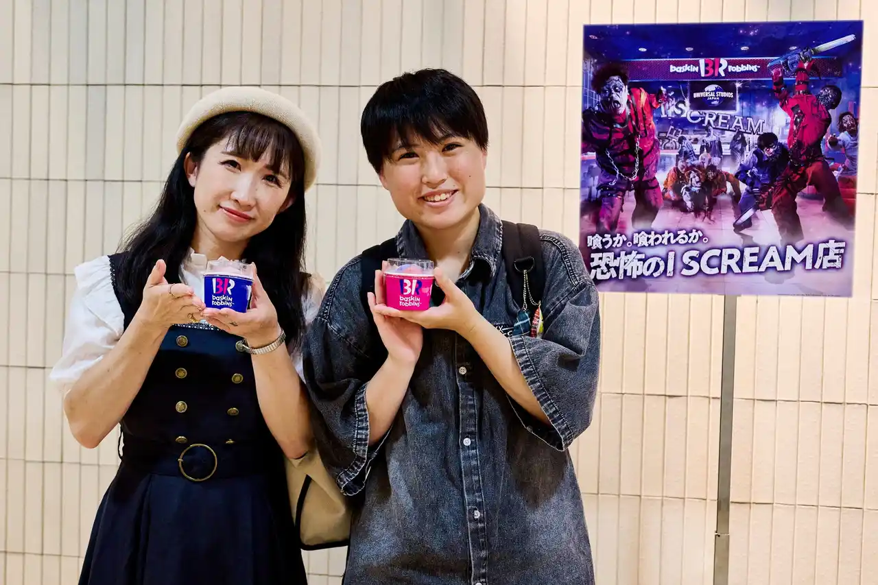| 「身近な見慣れた風景にゾンビがいるのが、怖いけどとても楽しかった。ゾンビが目の前にすごく近くに来るので、思わず叫びました。気軽に行ける東京の「サーティワン アイスクリーム」で、ユニバーサル・スタジオ・ジャパンのハロウィーンを体験できて嬉しい!パークのハロウィーンは、昼は明るくて楽しくて、夜は、ホラーやゾンビのハロウィーンと全然違うのが好きです。今年は、お昼のショーも楽しみだし、夜の『ストリート・ゾンビ』や新メイズ、新曲での『ゾンビ・デ・ダンス』も楽しみです。」(女性二人組/東京都在住) | ||||||||||