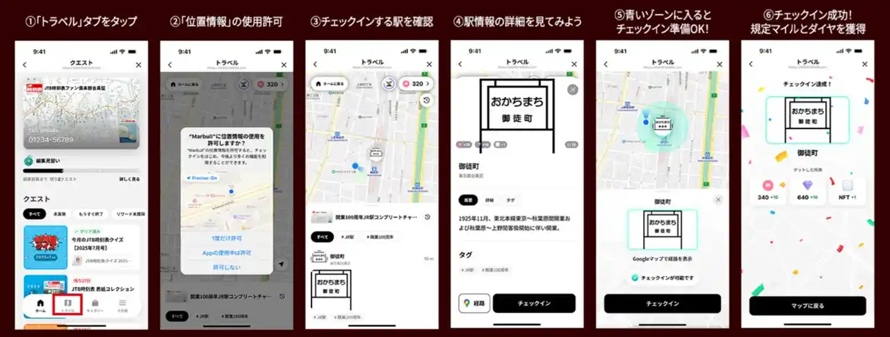 Marbull X株式会社(所在地:東京都渋谷区、代表取締役CEO:小川 翔太郎、代表取締役COO:佐藤卓、以下 「Marbull X」)は、株式会社JTBパブリッシング(所在地:東京都江東区、代表取締役 社長執行役員:盛崎宏行、以下 「JTBパブリッシング」)が展開する「JTB時刻表ファン倶楽部」の新企画「開業100周年JR駅コンプリートチャレンジ(β版)」に、Marbull Xが開発・提供する、NFTを活用した販促/観光DXソリューション「Marbullコネクト」の新機能「Marbullトラベル(β版)」を提供いたしました。 |