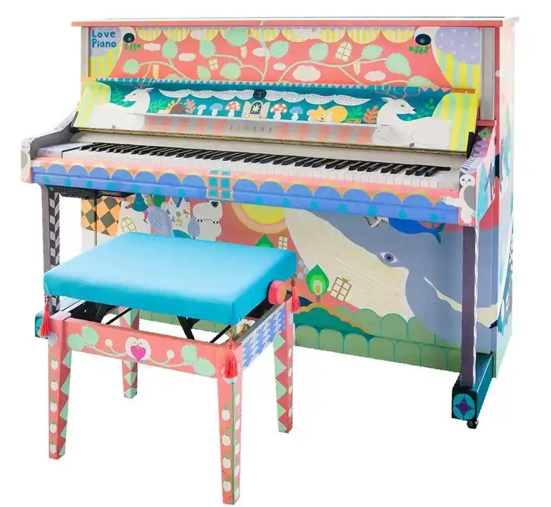 星野リゾートとヤマハミュージックジャパンのコラボレーション企画『旅するLovePiano』から誕生したピアノです。イラストレーターのデナリ (大野舞)さんが、マットで上品なピンクを基調に、クジラや渡り鳥をはじめ空想上の生き物までも描くことで、旅のわくわく感を表現されています。四国では、JR松山駅リニューアルイベントで設置されたことがあります。 |