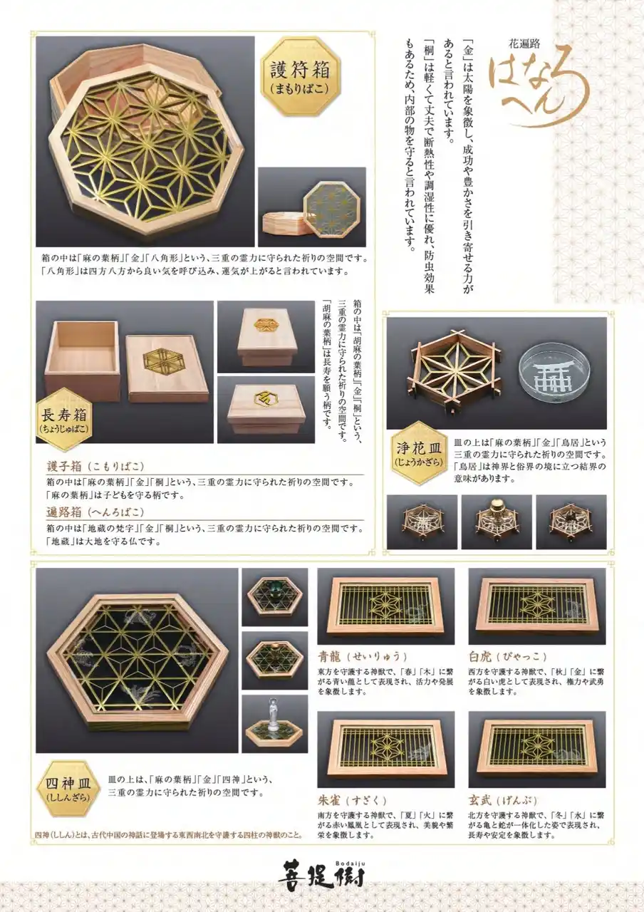 さらに、各製品には「胡麻の葉柄」や「麻の葉柄」、「四神」などの縁起の良いモチーフと「金」「桐」といった素材を組み合わせることで、「三重の霊力に守られた祈りの空間」を創り出しています 。これは、長年培われてきた職人の技術と、祈りに対する深い想いから生まれた、他にはない唯一無二のものです 。 |