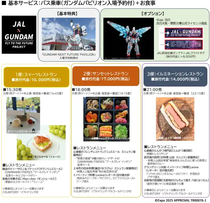 日本航空株式会社(本社:東京都品川区、代表取締役社長 グループCEO:鳥取 三津子、以下「JAL」)は、2025年9月5日(金)から10月13日(月)までの間、「GUNDAM NEXT FUTURE PAVILION」入場予約特典付きJAL×ガンダム レストランバス (*2) を大阪・関西万博の会場である夢洲(ゆめしま)から大阪市内まで1日3便運行します。本企画は「JAL×GUNDAM FLY TO THE FUTURE PROJECT」 (*1) の一環として企画され、3月の和歌山県白浜、4~6月東京都内での運行につづき、第3弾となります。10月13日の万博閉幕まで残り2ヵ月を切り、ますます盛況が想定される中、夕方から夜にかけて混雑する帰りの時間帯に、開放的な車内空間で特別なメニューとともに快適にお帰りいただくことができます。 |