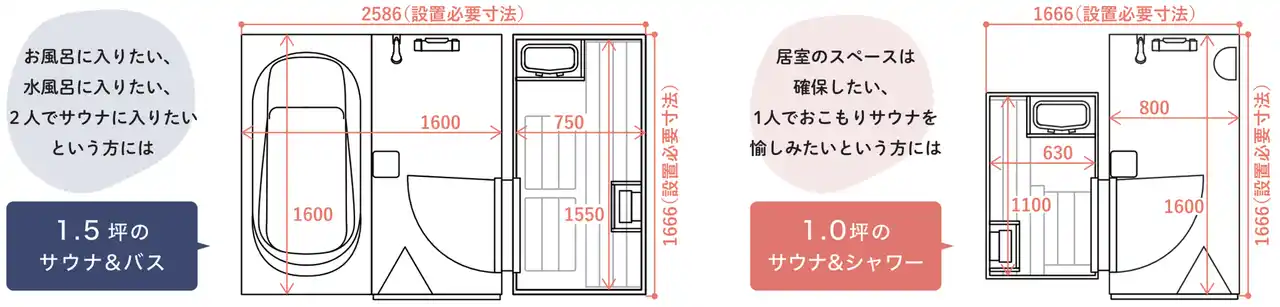1.5坪、1.0坪サイズのコンパクトなユニット化により、一般的な戸建住宅に取り入れやすくなり、プライベートサウナがより身近なものになりました。サウナはシステムバスルームの場合は2人用サイズ、シャワールームの場合は1人用サイズです。 |