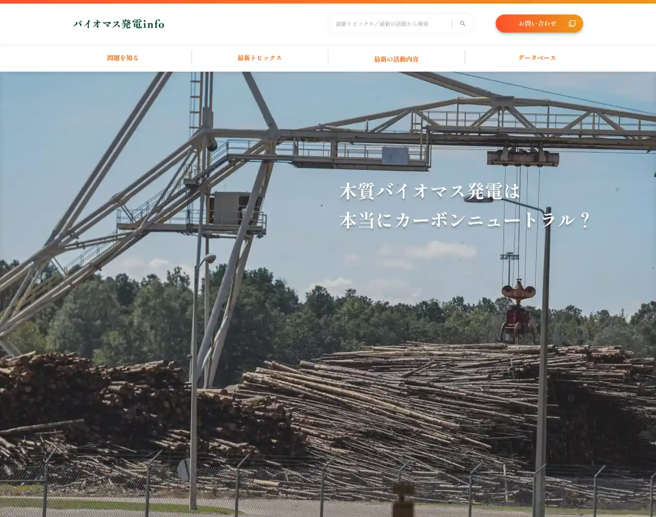 「バイオマス発電info」は、主にメディア関係者と再エネに関心を寄せる事業者や金融機関を対象に、再生可能エネルギー固定価格買取制度(FIT)で支援されている輸入木質バイオマスが、再エネとして「持続可能」なのかを検証できる情報を提供しています。 |