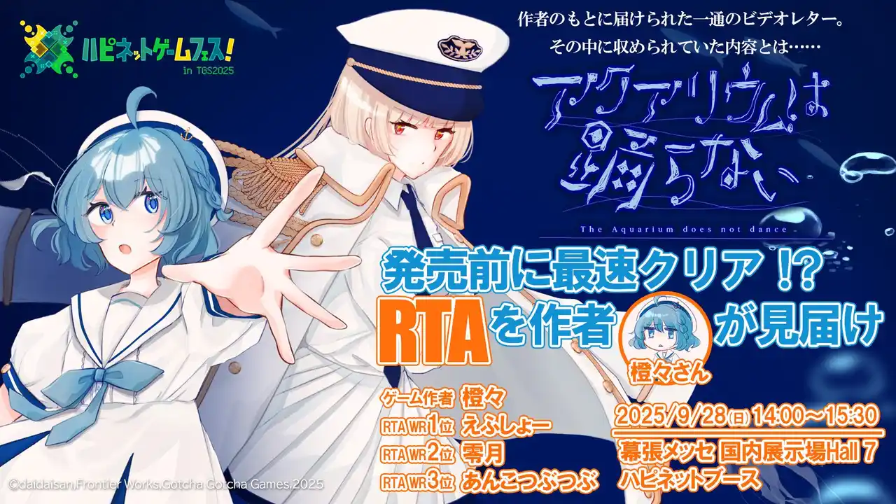 2025年10月30日パッケージ版発売予定「アクアリウムは踊らない」作者の橙々氏が登壇し、実況プレイを見ながら生トークをいたします。ゲストには本作リアルタイムアタック世界記録保持走者の皆さんを招き、撮り下ろしのビデオレターを持参いただきます。昨年末トレンドワードにもなった「公開デバッグ」が再び!? 作者も知らない裏技が見られるかも……ぜひ会場でご確認ください。 |