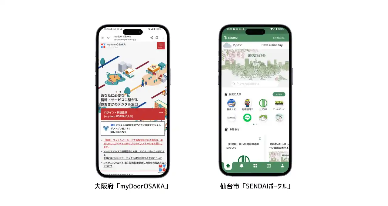 | 仙台市「SENDAIポータル」: SENDAIポータルは、より快適に暮らせるまちづくりを目指すため、一人一人に合ったお知らせを発信し、気象情報や災害情報を速やかに発信するサービスです。オンライン申請の手続きや、マイナンバーカード(xID)を連携することで郵送される文書をデジタル郵便として受け取ることができます。 | ||||||||||||