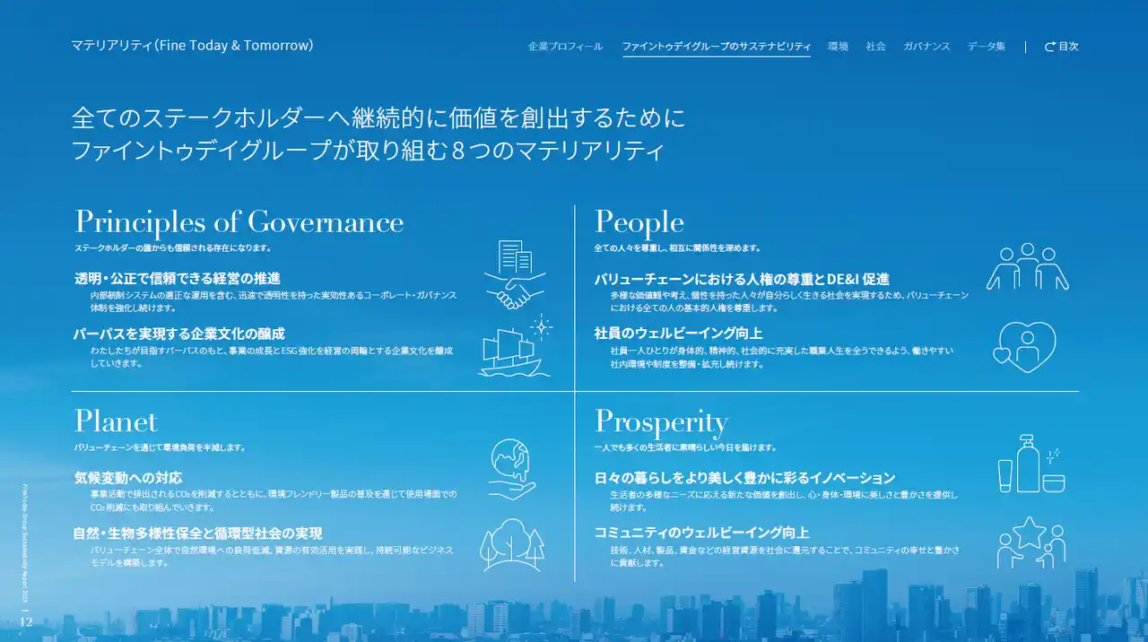 | 当社グループは、「世界中の誰もが、素晴らしい一日を紡ぎ、いつまでも美しく、豊かな人生を送れるようにすること」というパーパス実現に向けて、2030年までに取り組む重要課題として、4つの領域(ガバナンスの原則、ピープル、プラネット、共栄)を柱とするマテリアリティ「Fine Today & Tomorrow」を制定しています。これらに基づき、サステナビリティに資する様々な施策を、創業以来、事業運営と一体的に推進しています。 | |||||||||
