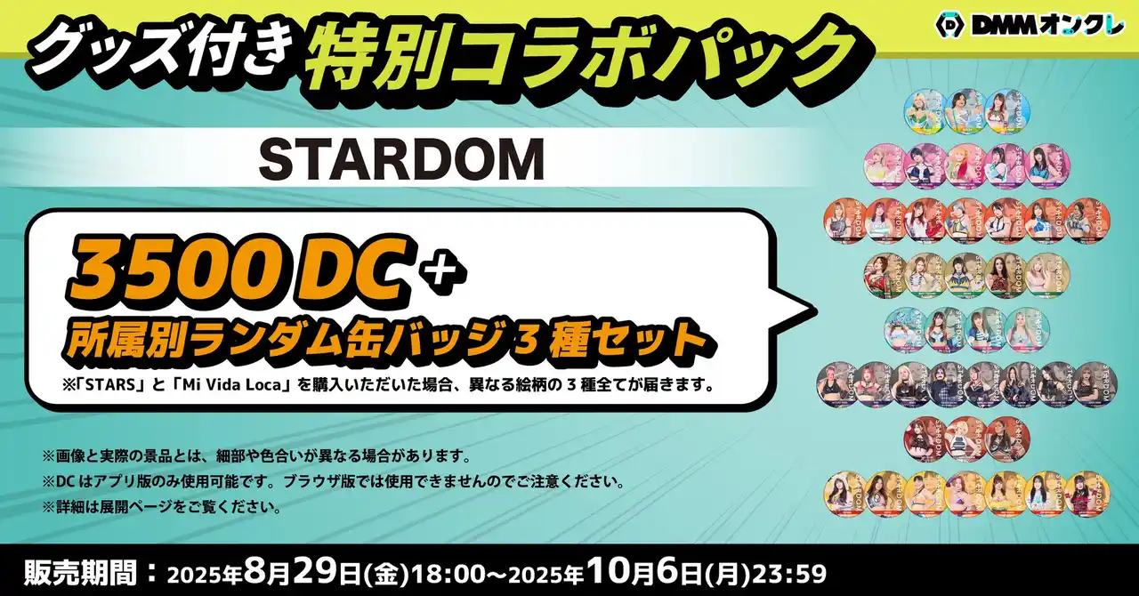 DMMオンクレのプレイに必要なDC(3,500DC)と、所属別のランダム缶バッジ3種がセットになったお得なDCパックを販売します。 |