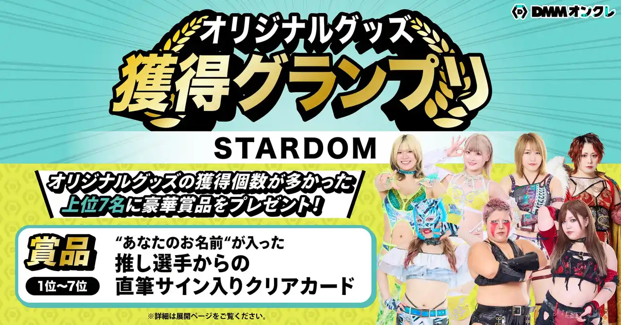 期間中に「STARDOM」オリジナルグッズを1個以上獲得した方のうち、各ユニット毎のグッズ獲得個数が多かった上位7名に、“あなたのお名前”が入った推し選手からの直筆サイン入りクリアカードをプレゼントする獲得グランプリを開催いたします。 |