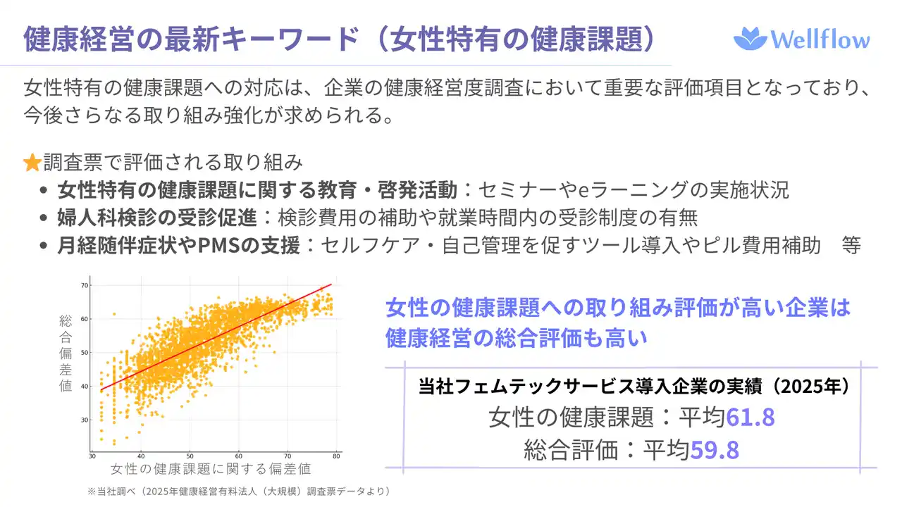 本資料では、2026年度の健康経営度調査の要件や評価結果に関するポイントと、特に女性の健康支援に注力して取り組み、業界他社よりも高い評価を得ている企業の記載例を紹介します。 |