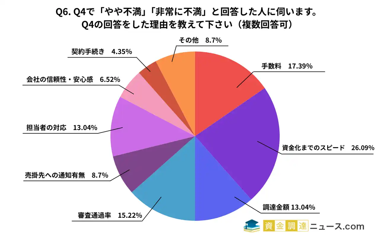 満足度が低かった理由として、最も多く挙げられたのは「資金化までのスピード(26.09%)」でした。これに続き、「手数料(17.39%)」が不満点として挙げられています。 |