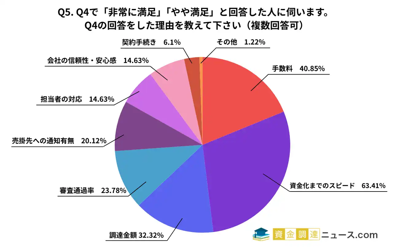 満足度が高い理由として、最も多かった回答は「資金化までのスピード(63.41%)」でした。これは、Q3で「資金化までのスピード」が最も重視されていたことから、実際にファクタリングを利用した際に期待通り、あるいはそれ以上の迅速さを実感できたことを示しています。ファクタリングの最大のメリットが迅速な資金調達であることを裏付ける結果です。 |