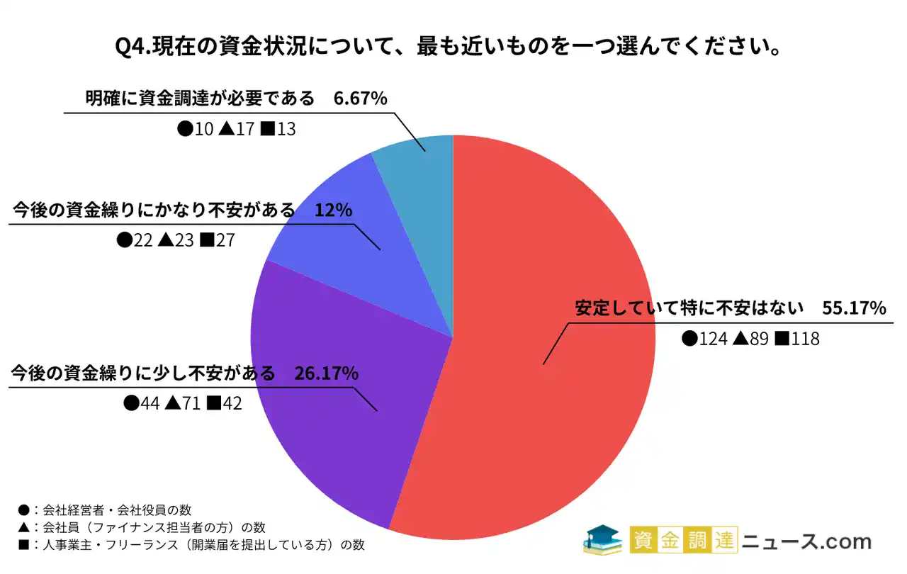 一方で、「今後の資金繰りに少し不安がある」「今後の資金繰りにかなり不安がある」、また「明確に資金調達が必要である」と回答した層も一定数存在します。これら不安や資金調達の必要性を感じている層を合わせると、全体の約45%となり、約半数近くの回答者が資金繰りに関する課題を抱えていることが分かります。 |