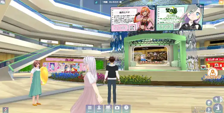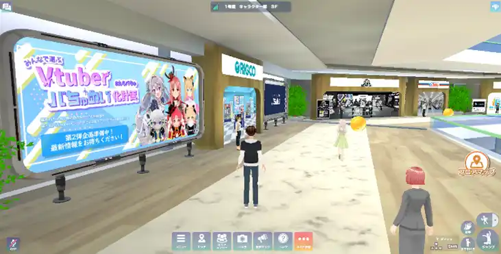 スマートフォンやパソコン、タブレットなどからアプリ無しでもログインし、アバターを操作することで、オンラインショッピングやライブイベントなどが楽しめるメタバースの商業施設です。キャラクターショップが集積された1号館、神保町の古書店、神田カレーグランプリ受賞店、秋葉原のメイドカフェ、お茶の水楽器店などが集積された2号館、47都道府県のご当地VTuberが方言で応援大使を務めるお店が集積された3号館、ゲームショップが集積された4号館、デザイナー、アーティストなどのクリエイターのお店が集積された5号館、小学生にも楽しんでもらえる6号館等、現在250店舗以上のお店や、写真展会場、イベント会場、現在900名以上が参加し、1分ごとにVTuberが紹介されるVtuber時計などが展開されています。 |