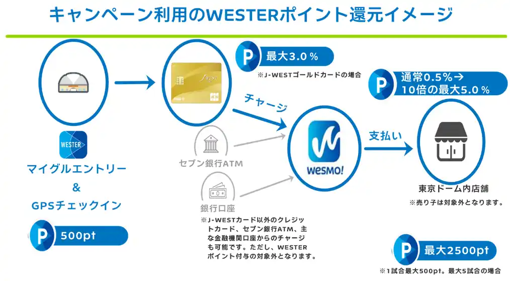Wesmo!にチャージして東京ドームにおいてチェックイン&Wesmo!にチャージ・対象店舗でのWesmo!ご利用によりWESTERポイント(期間・用途限定)最大1,000pt還元 |