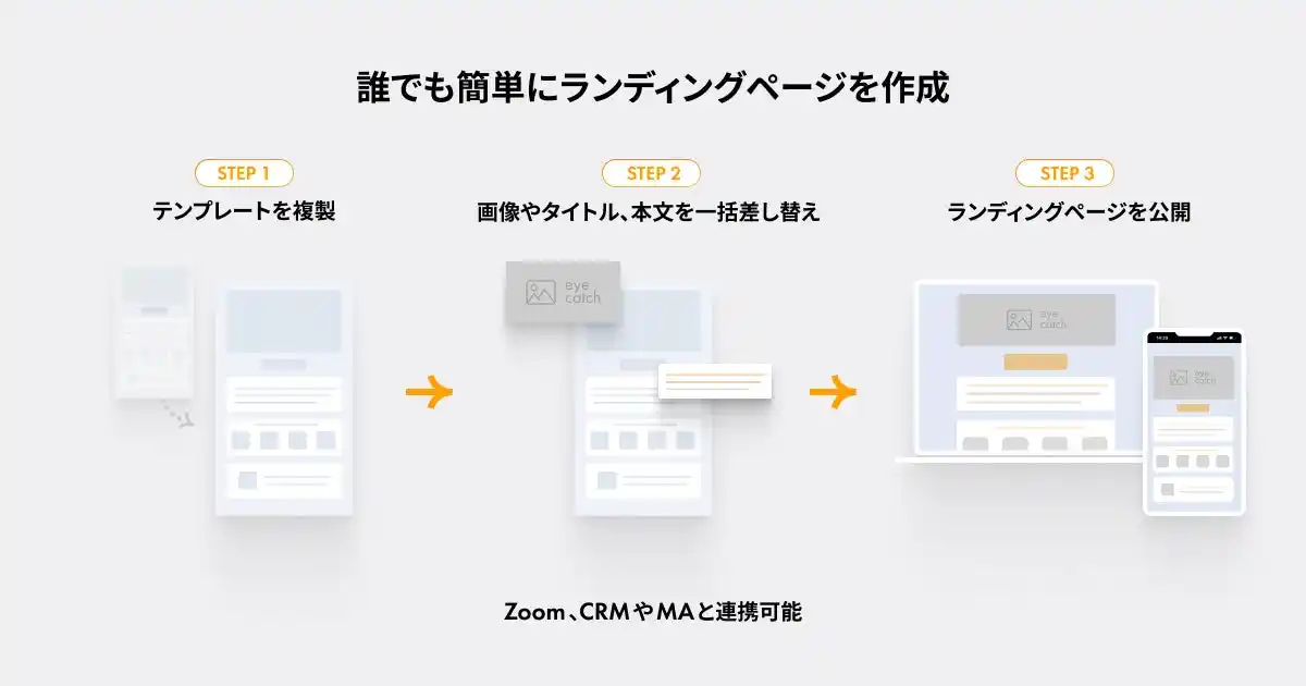 | ランディングページテンプレートを複製し、タイトルや本文、画像などの変数を一括で差し替えるだけで、誰でも簡単にランディングページを作成できるようになります。 | |||