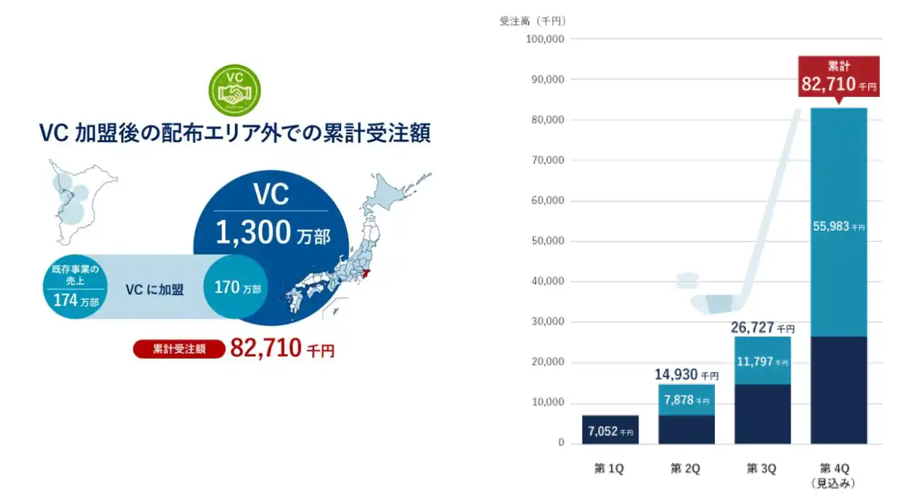 中広が展開するVC(ボランタリー・チェーン)は、全国のフリーペーパー事業主で構成される組織です。VC加盟や媒体ネットワークとの連携により、年間 7,000 社の取引先に対して、全国約1,300 万部/月への広告提案が可能になりました。その結果、『ちいき新聞』配布エリア外での累計受注額は、2024年9月から2025年8月までの累計で82,710千円となりました。今後も、全国規模での広告展開を加速し、新たな市場の開拓を進めてまいります。 |