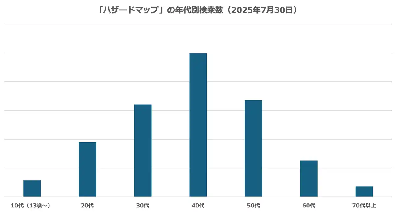 2025年7月30日にカムチャツカ半島沖地震が発生し、全国的に津波警報が発表されました。これを受けて「Yahoo!検索」で検索傾向を分析したところ、7月30日に「ハザードマップ」の検索数が前週平均の約15倍に、同31日には約3倍に増加、「地名 ハザードマップ」の検索数は7月30日に前週平均の約72倍、同31日には約7倍に増加し、防災情報への即時アクセスや地域別の情報の確認ニーズが高まったことがわかりました(※1)。また、年代別での7月30日の「ハザードマップ」の検索数は、40代が最も多く、次いで50代、30代と続きました(※2)。 |