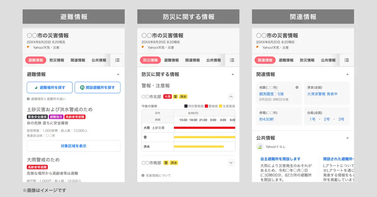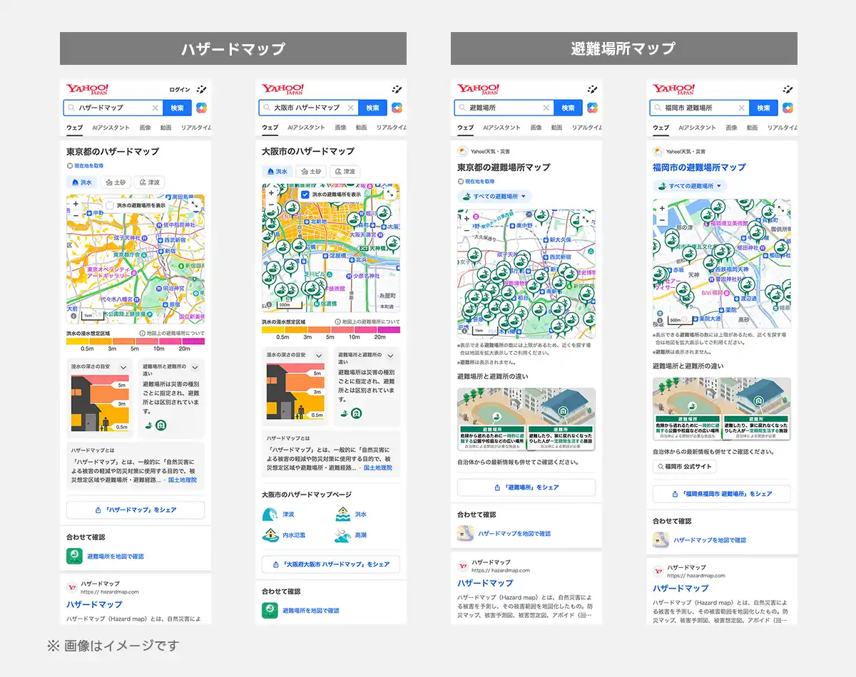 「Yahoo!検索」では、災害発生時に必要な情報をすばやく確認し、迅速に身を守る行動が取れるよう、避難情報や気象警報などの災害関連情報を市区町村別にまとめて検索結果上に掲出しています。 |