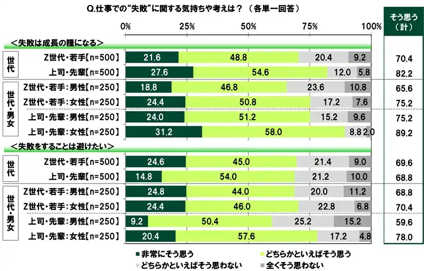 ≫「失敗は成長の糧になると思う」Z世代・若手の70.4%、上司・先輩では82.2%