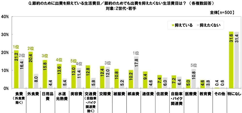 Z世代・若手(500名)と上司・先輩(500名)に、節約のために出費を抑えている生活費目、節約のためでも出費を抑えたくない生活費目のそれぞれについて聞きました。