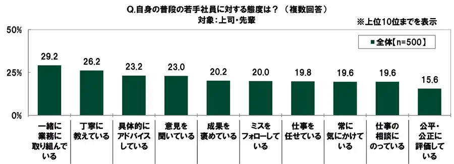 上司・先輩(500名)に、自身の普段の若手社員に対する態度を聞いたところ、「一緒に業務に取り組んでいる」(29.2%)が最も高くなり、「丁寧に教えている」(26.2%)、「具体的にアドバイスしている」(23.2%)、「意見を聞いている」(23.0%)、「成果を褒めている」(20.2%)が続きました。若手と協力して仕事を進めている人が多いようです。