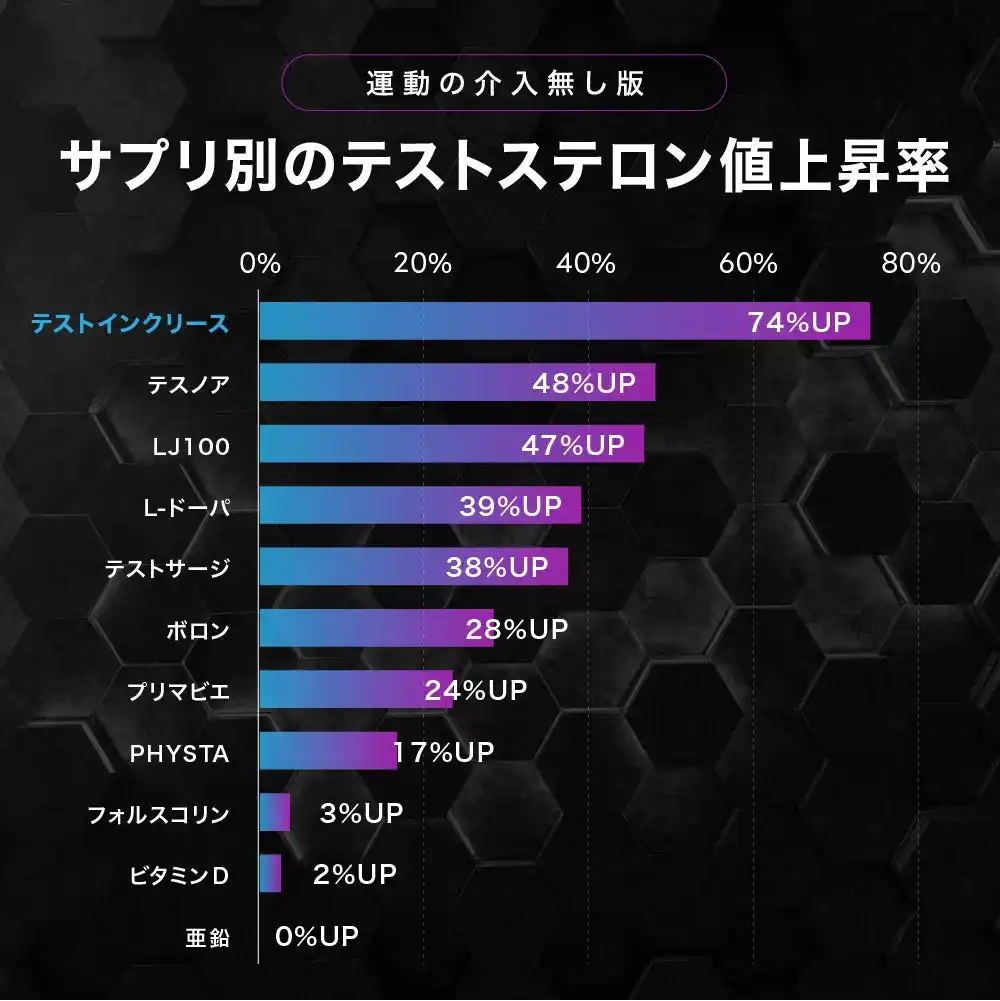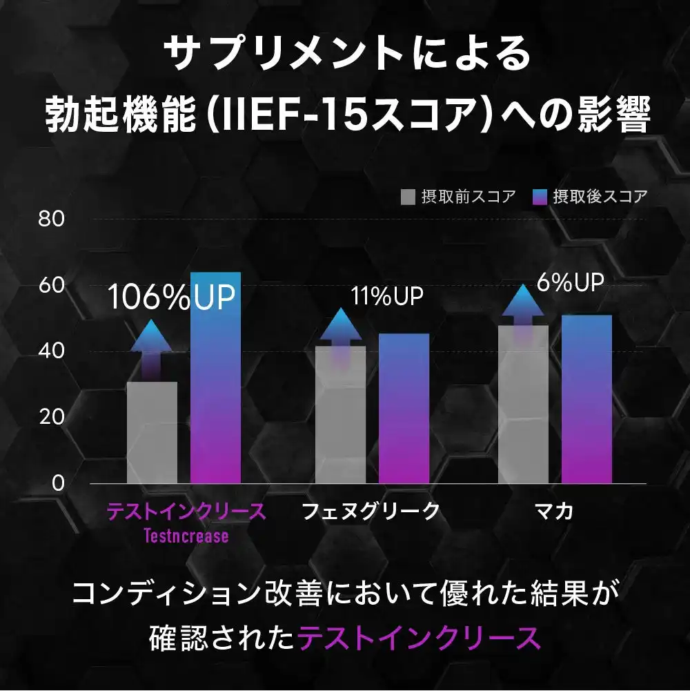 テストインクリースは海外でも注目されつつある素材であり、その理由は1.テストステロン値の上昇率と、2.性パフォーマンスの改善率の大きく2つがあります。 |
