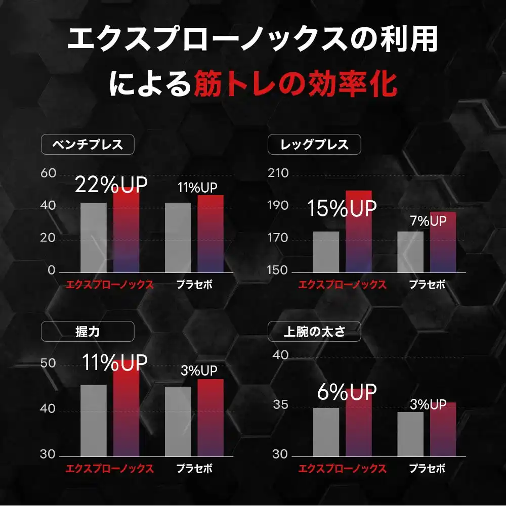 エクスプローニックスは特にアスリートやトレーニーに向けて開発された最新の原料であり、「1.mTORへのアプローチ」と「2.ワークアウトパフォーマンスの向上」そして「3.テストステロン値の上昇」が研究によって確認されています。 |