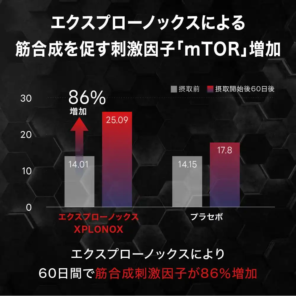 実際に2023年にインドの医療機関(Medstar Specialty Hospital)で、行われた調査では、1日500mgのエクスプローノックスを60日間継続的に被験者に摂取させたところ、mTORの総量が86.22%も増加(プラセボ群と比べて3.3倍の上昇率)が確認されました。 |