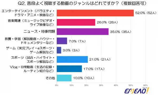 最も多かったのは「エンターテインメント(バラエティ・ドラマ・アニメ・映画など)」で、52.0%(52人)が視聴していました。娯楽要素の強い動画が主要な視聴対象となっていることがうかがえます。