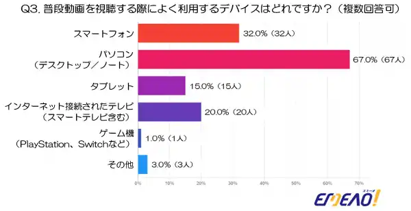 一方で「ゲーム機」(1.0%、1人)や「その他」(3.0%、3人)はごく少数にとどまり、動画視聴のデバイスとしては主要な位置づけにはなっていないことがうかがえます。