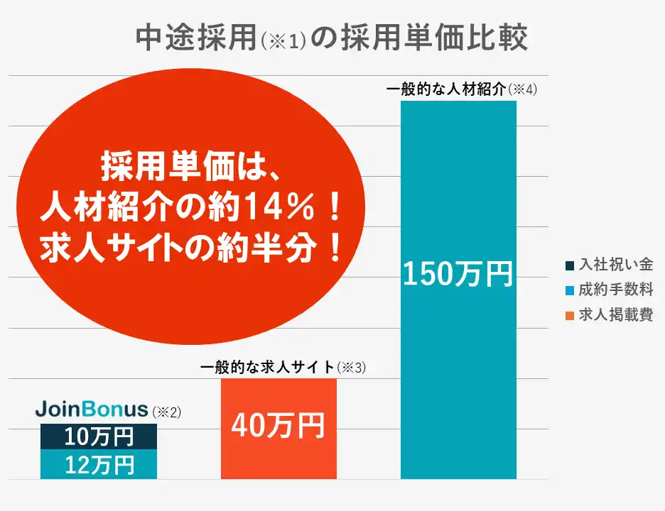 例えば、中途採用の場合に、入社祝い金として100,000円を支給したとしても、ジョインボーナスを利用した場合の採用コストは、一般的な人材紹介の14%、求人サイトの約半分です。 |
