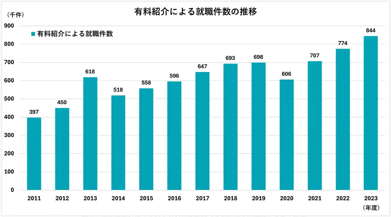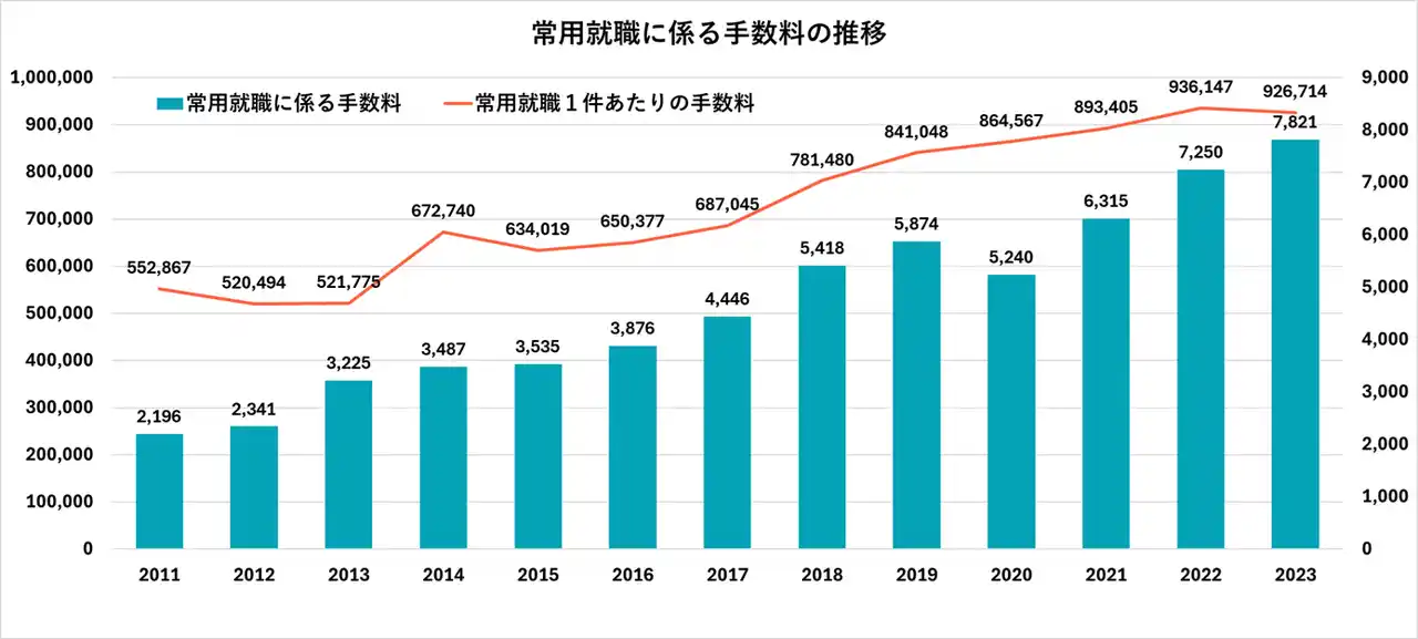 上記グラフのとおり、2011年に397,000件だった有料職業紹介事業者を介した就職件数は、2023年度にはその2倍以上の844,000件まで増加しています。 また、同時に常用就職(雇用契約において雇用期間の定めがないか又は4か月以上の雇用期間が定められているもの)に係る1件あたりの手数料も増加傾向です。 |