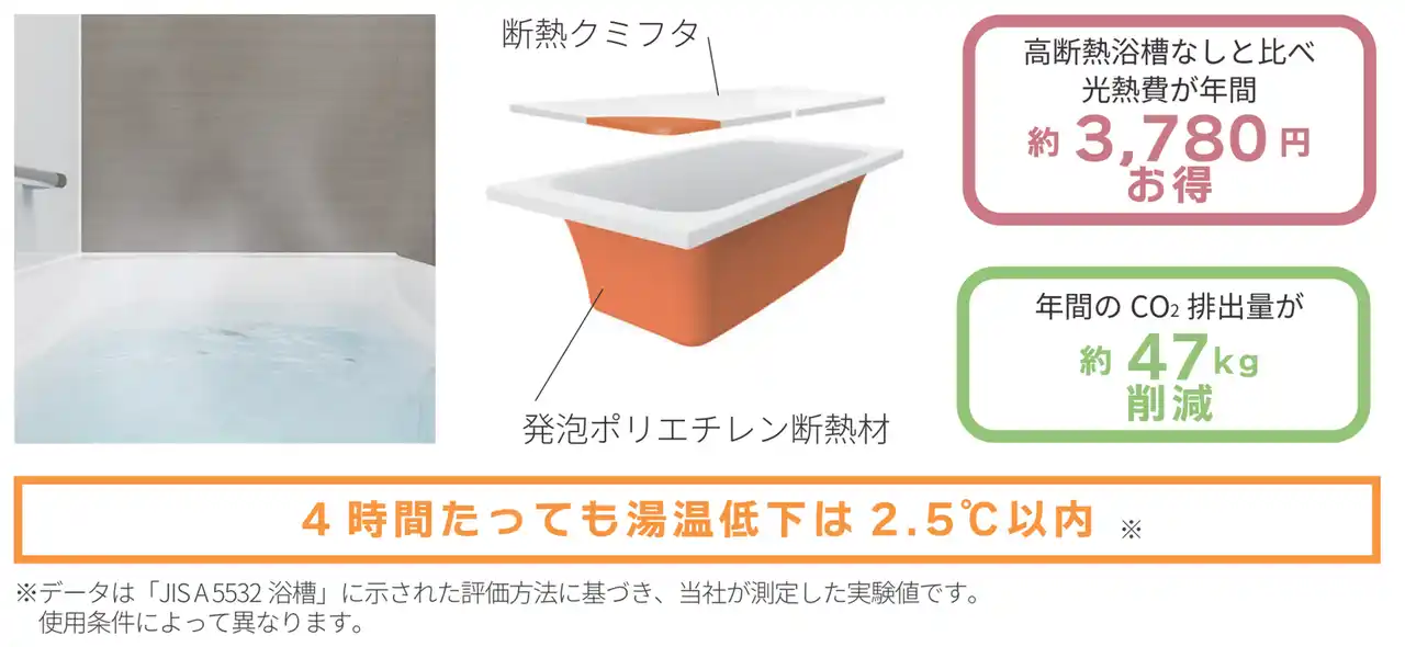 浴槽断熱と断熱クミフタによって長時間たっても冷めにくい、保温効果の高い断熱構造。追いだきが少なくて済むため、光熱費の節約とCO2の削減に繋がります。 |