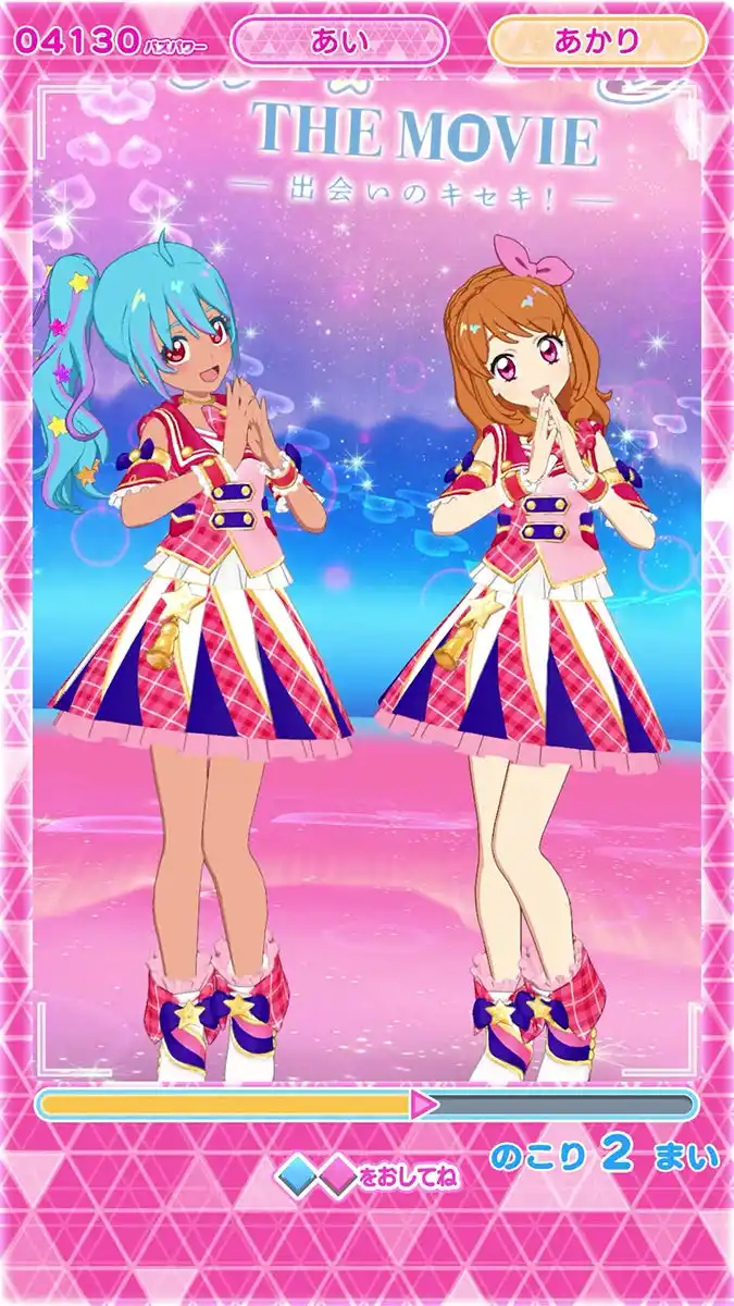 | 今回のコラボレーションでは、『アイカツ!』の「大空あかり」のコーデ(衣装)である 「ピンクパレードコーデ」 を着た「ひまり」「みつき」のアイプリカード2種が登場します。カードは「ひまり」「みつき」とお揃いのコーデを着た「あかり」が並んでいるコラボ感溢れるデザインとなっています。また、そのカードを使ってゲームをプレイすると『アイカツ!』のテーマ曲「START DASH SENSATION ~あかりソロ Ver.~」で遊ぶことができます。さらにライブ中は、画面上に「あかり」が応援に来てくれます。 | |||||||||||||||||||||