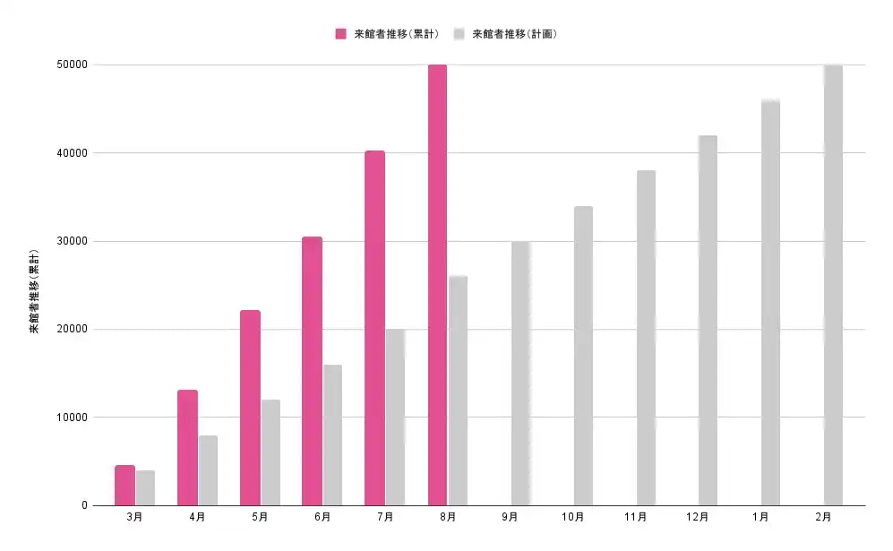 | 開館初日から450名分の前売り券が完売するなど、大きな注目を集めてスタートした奈良おもちゃ美術館は、春休みやゴールデンウィーク、夏休みなどの長期休暇に伴った来館需要に加え、メディア取材やSNSを使った情報発信の効果もあり、6月の時点で目標来館者数の半数である25,000名を突破。各月で、目標を大きく上回るペースで来館者数を伸ばしてきました。 | ||||||||||||||