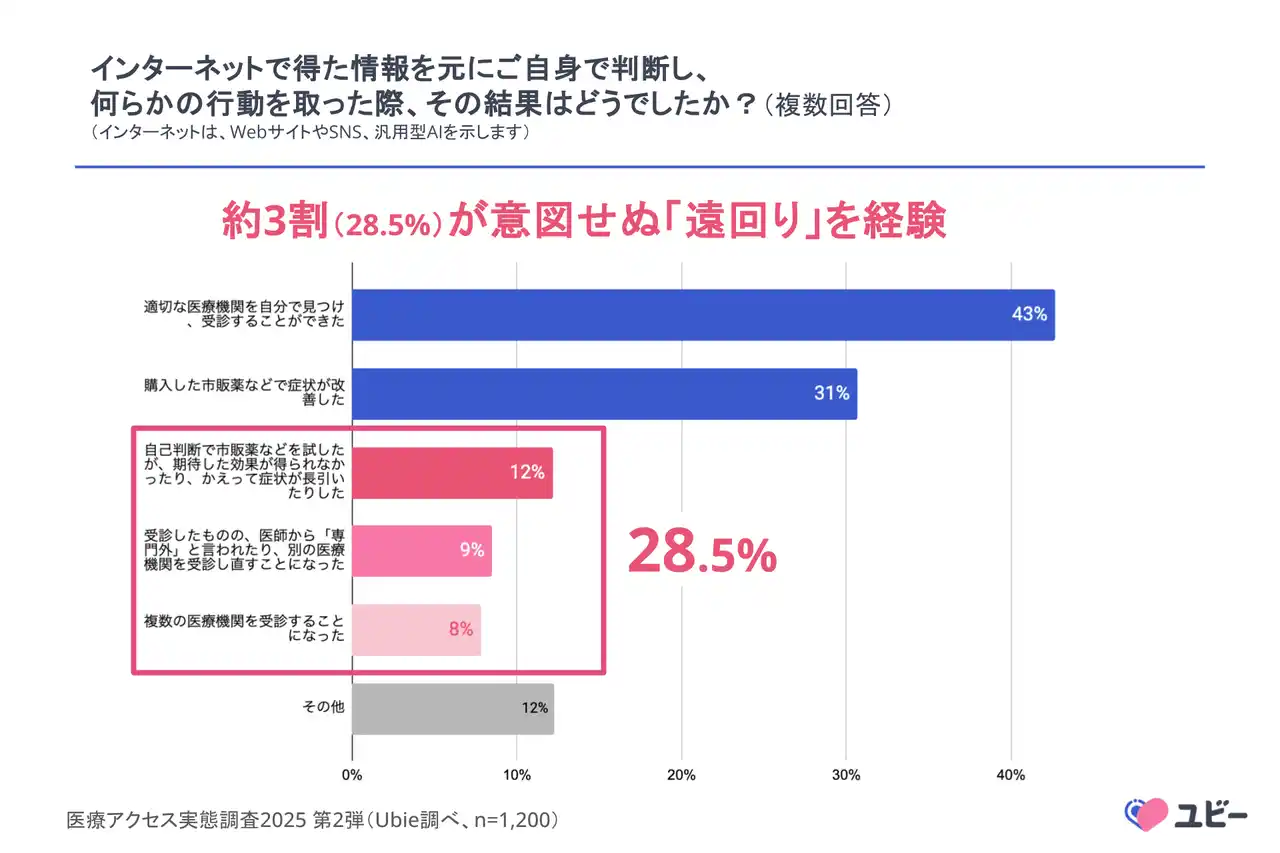 得た情報を元に行動した結果、延べ約3割(28.5%)が、専門外の医療機関を受診してしまったり、自己判断で試した市販薬で症状が長引いたり、複数の医療機関を受診することになったなど、結果的に最適な医療から遠回りしてしまった経験があることが明らかになりました。 |