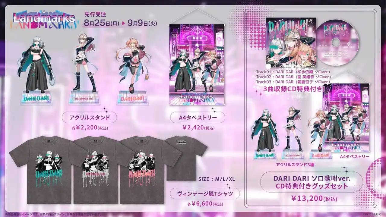 | ピー氏による描き下ろしイラストを使用した「アクリルスタンド」や「A4タペストリー」、「ヴィンテージ風Tシャツ」に加え、『ダリダリ』のソロ歌唱Ver.を収録した特典CD付属のグッズセットをご用意しました。 | ||||||||||||||