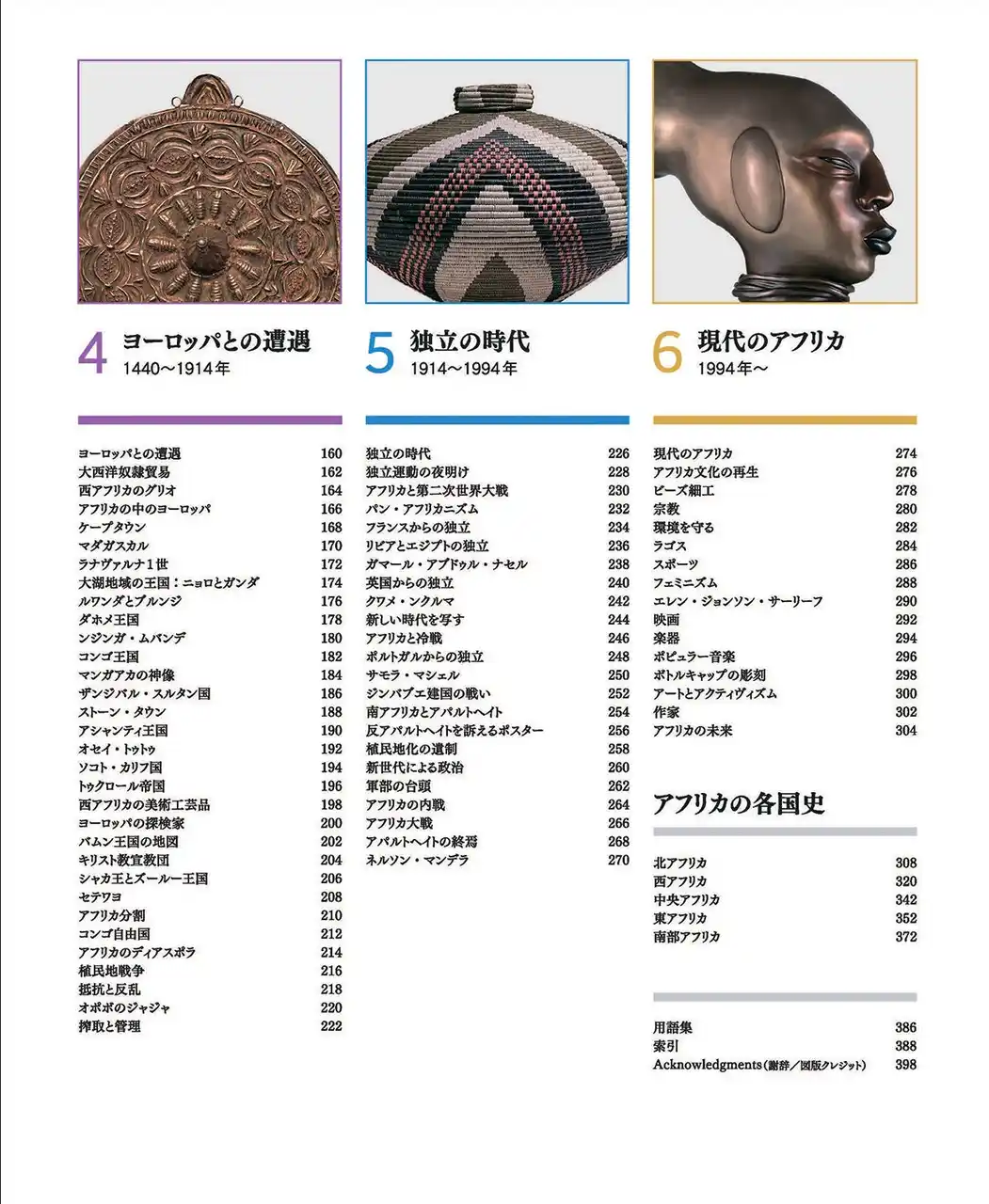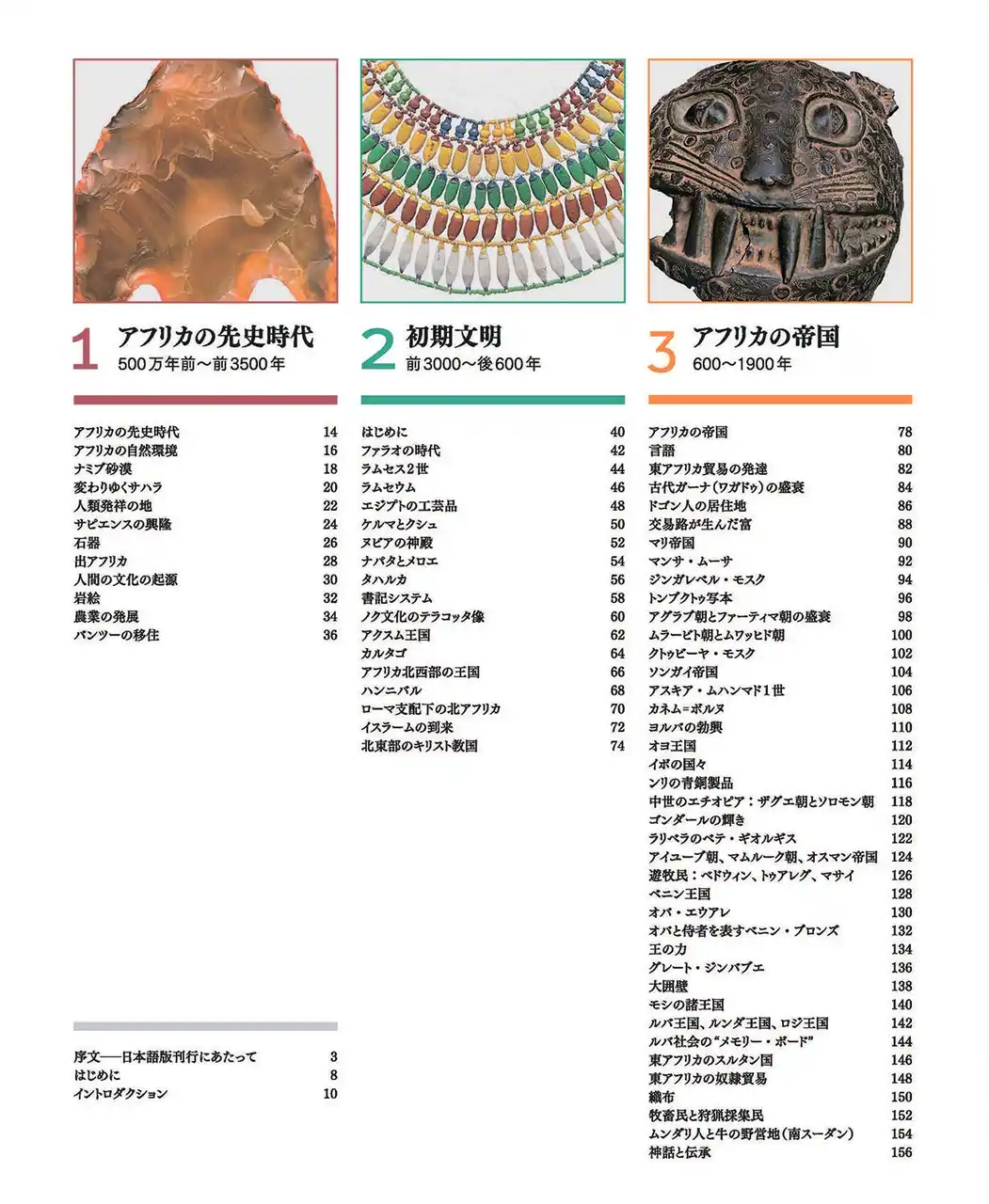 序文ー日本語版監修にあたって はじめに イントロダクション 1.アフリカの先史時代 500万年前~前3500年 2.初期文明 前3000~後600年 3.アフリカの帝国 600~1900年 4.ヨーロッパとの遭遇 1440~1914年 5.独立の時代 1914~1994年 6.現代のアフリカ 1994年~ アフリカの各国史(北アフリカ 西アフリカ 中央アフリカ 東アフリカ 南部アフリカ) |
