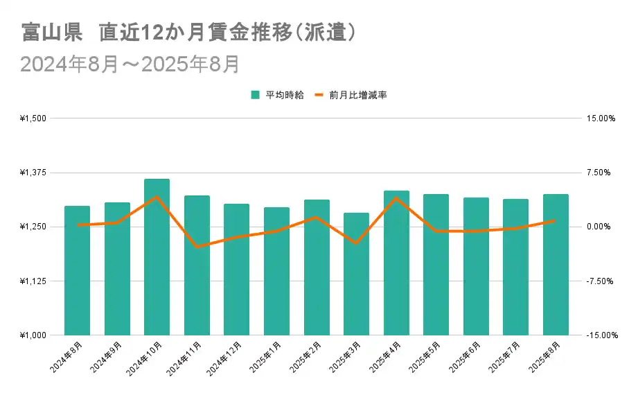 1位の富山県と47位の奈良県における直近12か月の賃金推移を比較すると、富山県では2024年10月に時給が1,360円まで上昇した後、一時下落したものの、2025年4月以降は1,320円台から1,330円台で安定的に推移。2025年8月には1,325円となっています。 |