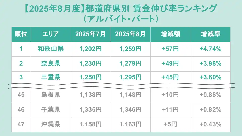 アルバイト・パートの都道府県別賃金伸び率ランキング(前月比)トップ3は、1位が和歌山県(増加額+57円、増加率+4.74%)、2位が奈良県(増加額+49円、増加率+3.98%)、3位が三重県(増加額+45円、増加率+3.60%)でした。 |