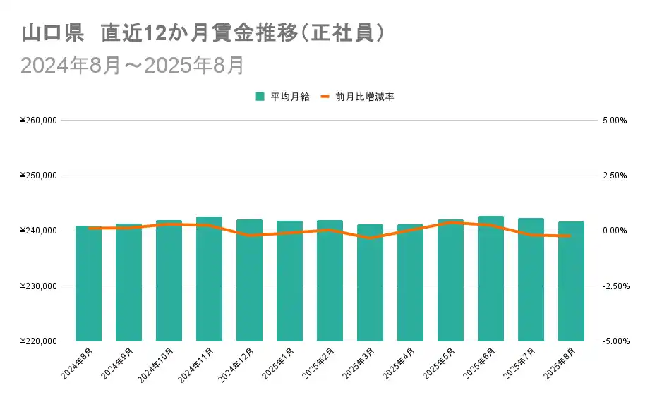 山口県の平均月給は241,000円から242,000円台の範囲で横ばいで推移しています。 |
