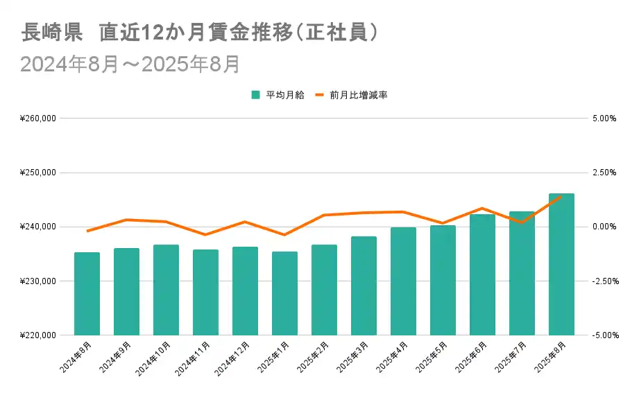 1位の長崎県と47位の山口県における直近12か月の賃金推移を比較すると、長崎県の平均月給は2024年8月以降、概ね上昇基調で推移。特に2025年4月以降は連続して上昇し、2025年8月には246,218円に達しています。 |