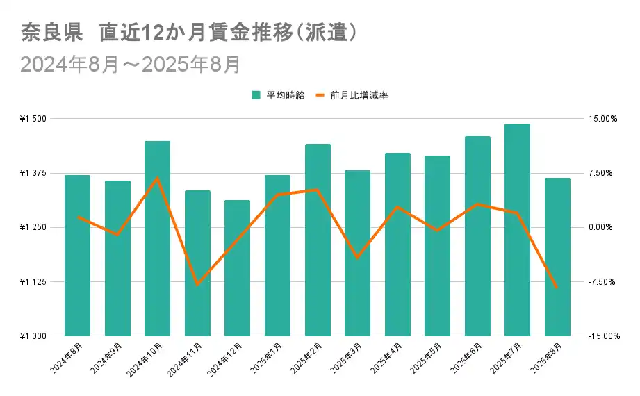 奈良県の平均時給は1,300円台から1,400円台の間で大きく変動しており、2025年7月に1,489円まで上昇した後、2025年8月には1,364円へと大幅に下落しました。特定の派遣企業が複数出稿していた、時給2,500円の看護師求人の掲載終了が影響しています。 |