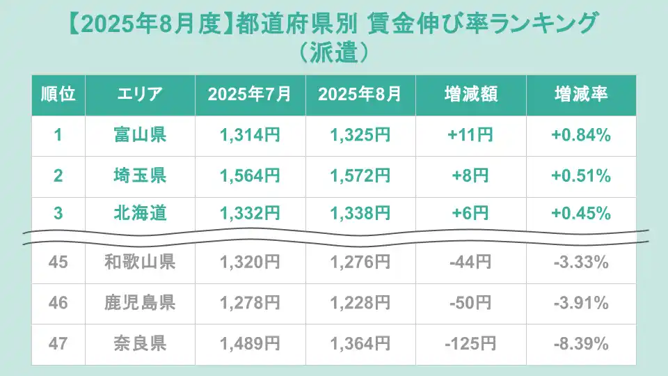 派遣の都道府県別賃金伸び率ランキング(前月比)トップ3は、1位が富山県(増加額+11円、増加率+0.84%)、2位が埼玉県(増加額+8円、増加率+0.51%)、3位が北海道(増加額+6円、増加率+0.45%)でした。 |