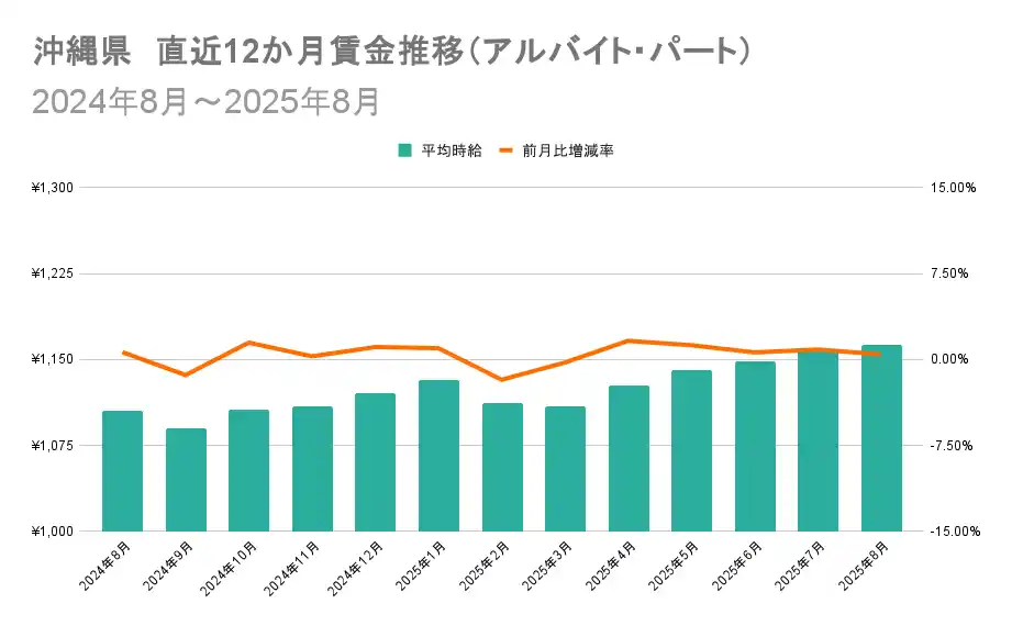 沖縄県の平均時給は大きな増減なく、横ばいでの推移を見せています。 |