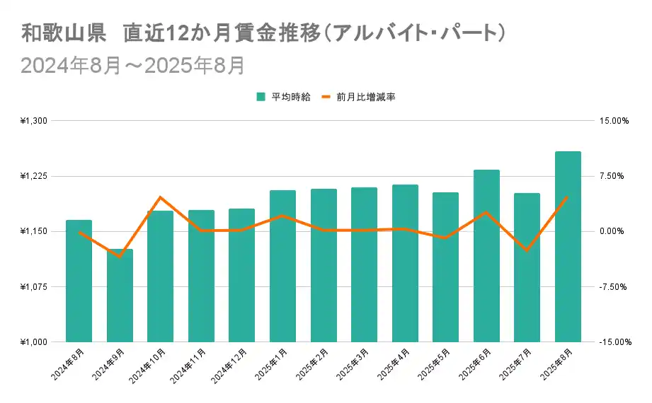 1位の和歌山県と47位の沖縄県における直近12か月の賃金推移を比較すると、和歌山県の平均時給は2024年8月から2024年9月にかけて一時下落したものの、その後は上昇基調で推移。2025年2月以降は1,200円台を維持し、2025年8月には1,259円に達しています。 |