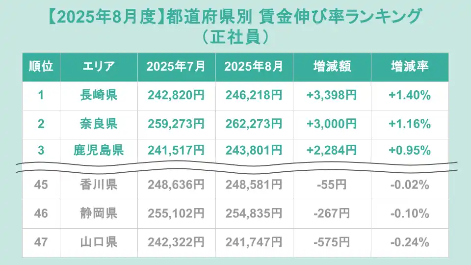 正社員の都道府県別賃金伸び率ランキング(前月比)トップ3は、1位が長崎県(増加額+3,398円、増加率+1.40%)、2位が奈良県(増加額+3,000円、増加率+1.16%)、3位が鹿児島県(増加額+2,284円、増加率+0.95%)でした。 |