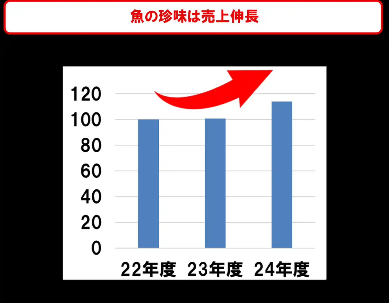 珍味市場において、えいひれ、焼あじ、鮭とばなど魚素材の製品が長く親しまれており、健康志向の高まりも追い風となって魚系ジャンルは拡大傾向にあります。 |